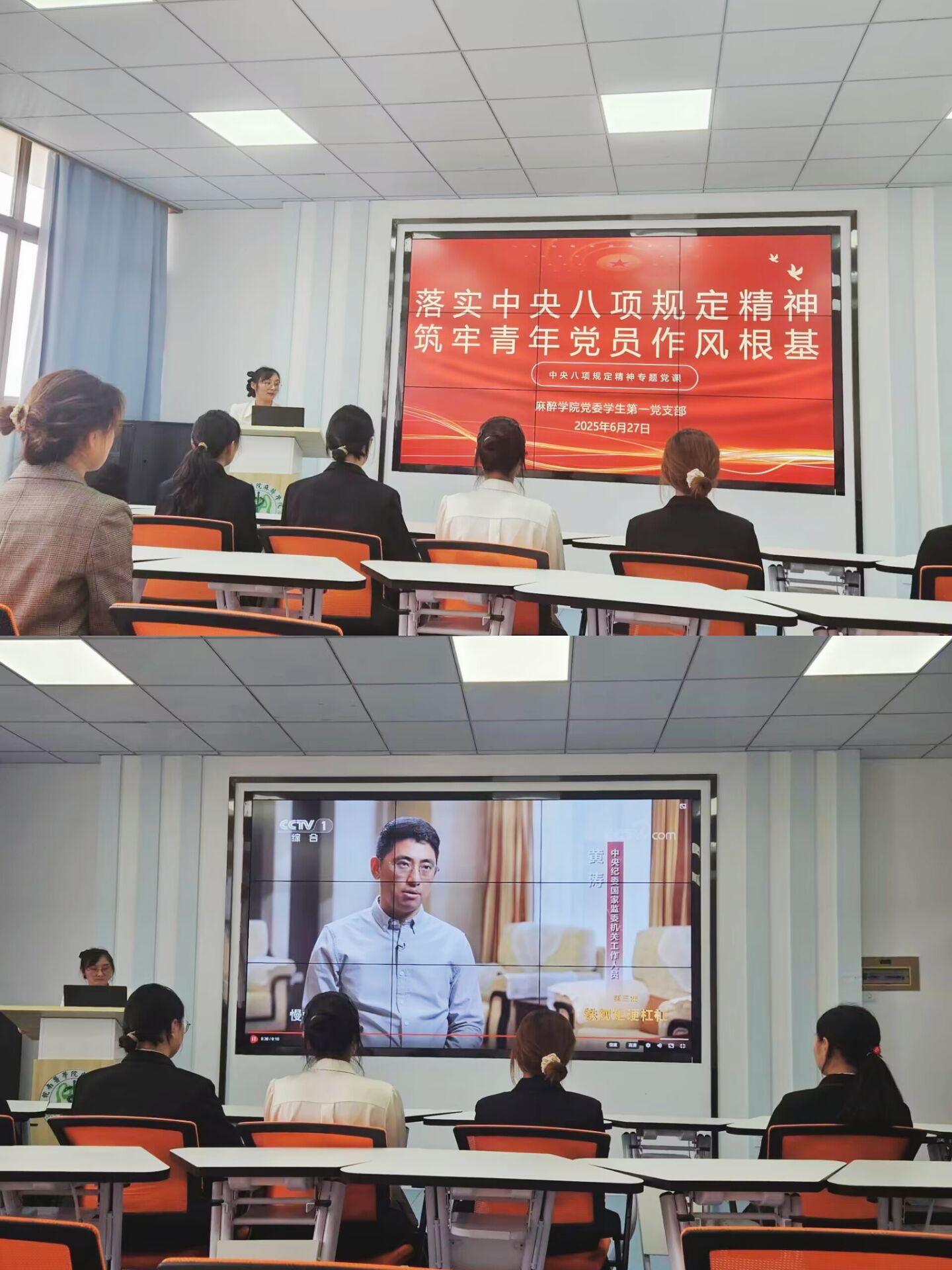 专题党课强信念,八项规定树新风。支部书记以“持之以恒落实中央八项规定精神 筑牢青年党员作风根基”为题讲授专题党课。党课围绕学习领会和贯彻执行中央八项规定及其实施细则精神,以“典型案例+警示教育”形式,从“出台背景、核心要义、实践要求”三个维度深入解读中央八项规定精神,结合高校师生身边的“四风”问题典型案例,强调青年党员要以“永远在路上”的清醒抵制形式主义、官僚主义。
