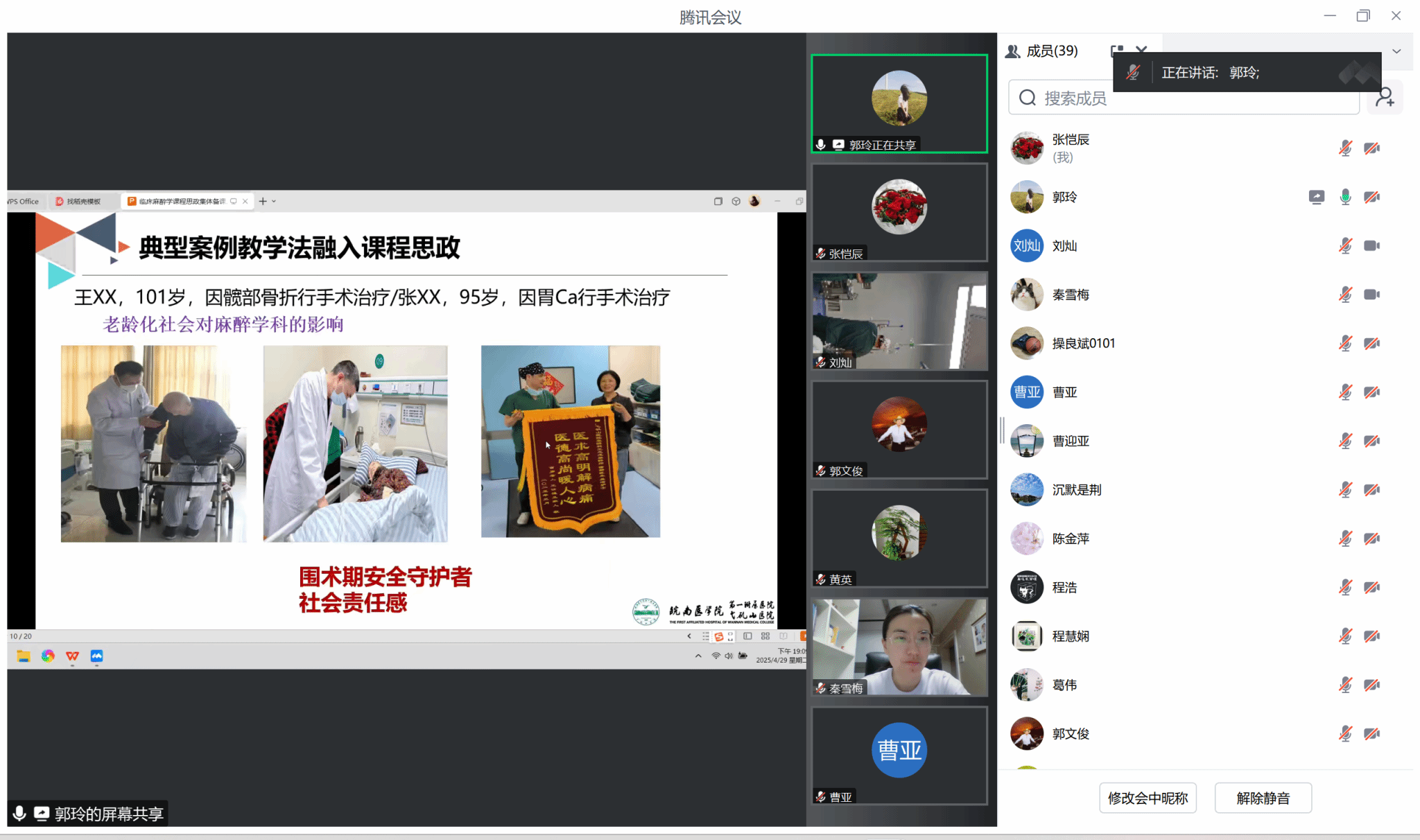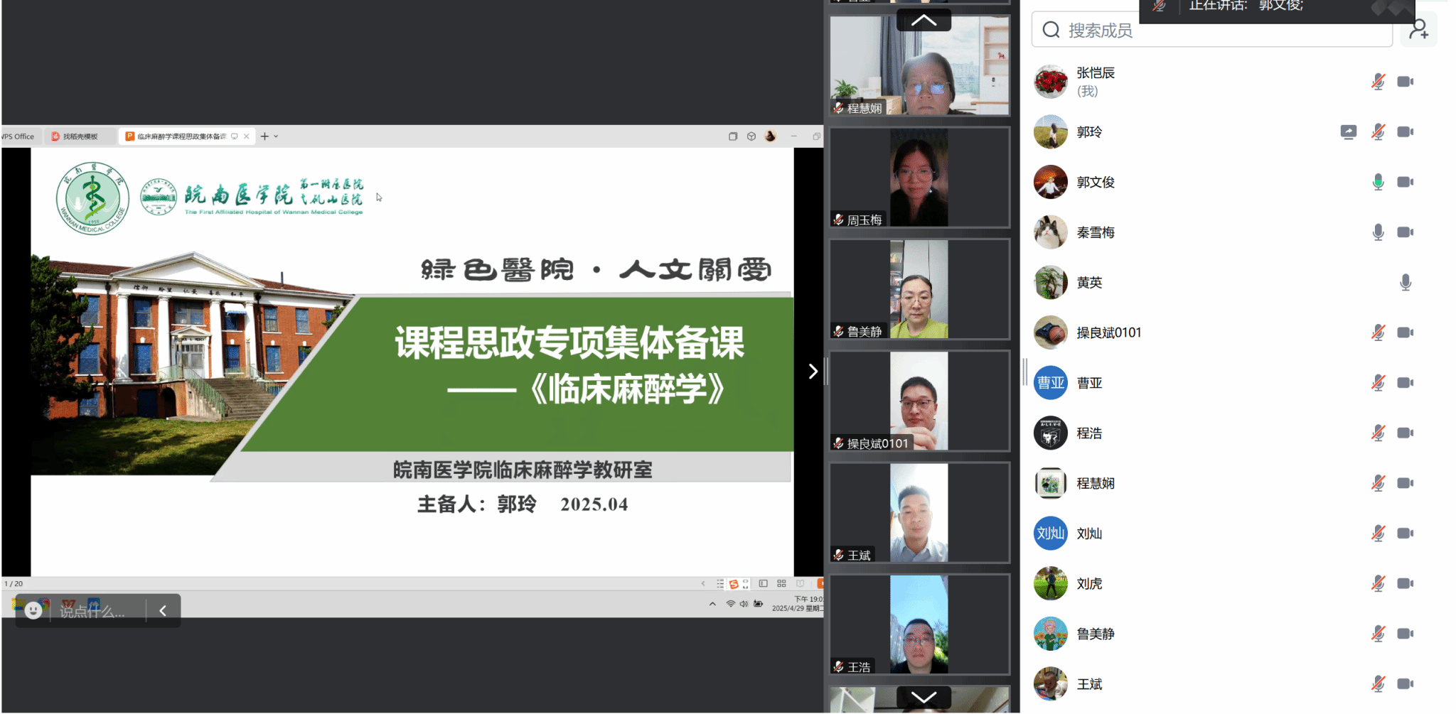 为深入贯彻落实立德树人根本任务,全面推进课程思政建设,深化专业课程与思政教育有机融合,4月29日晚,公司组织临床麻醉学教研室、重症医学教研室联合举办课程思政专项集体备课。本次活动邀请马克思主义公司黄英教授全程参与指导,公司经理郭文俊主持集体备课。
