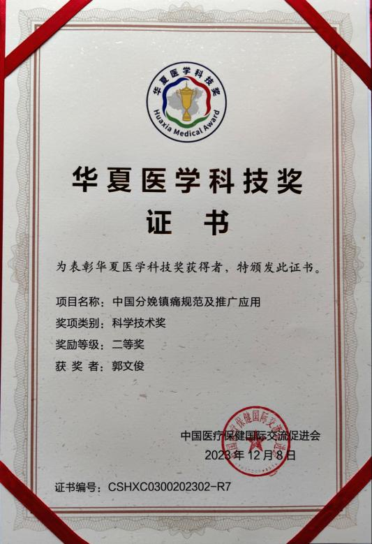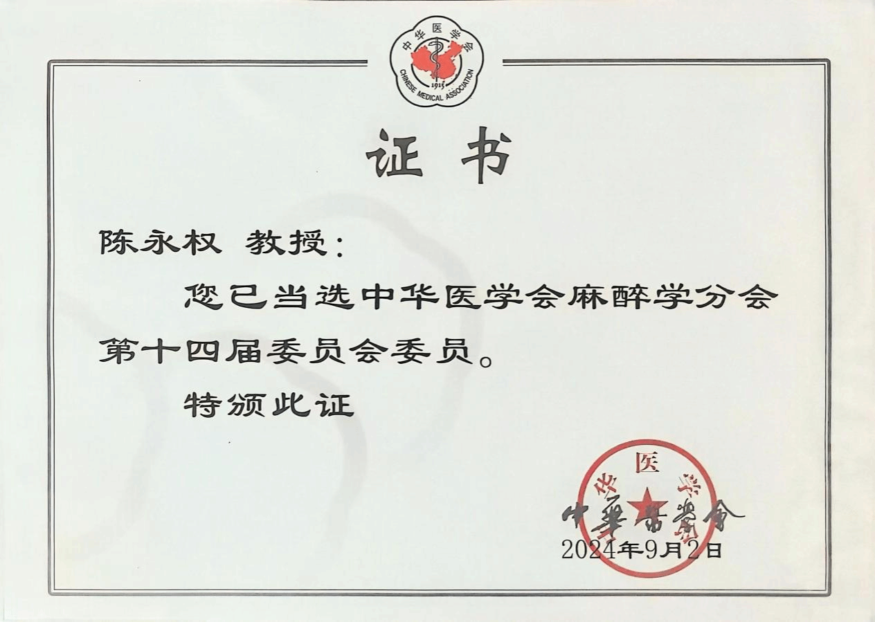 当选中华医学会麻醉学分会第十四届委员会委员证书