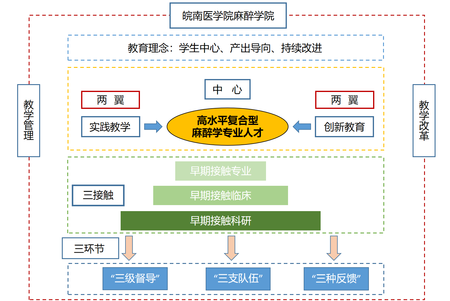坚持“德育为先、能力为重、全面发展”的育人观念,坚持“以本为本”,全面推进“四个回归”,按照“定位准确、注重内涵、突出优势、强化品牌”的原则,在麻醉学专业获批国家级专业综合改革试点专业、安徽省特色专业和安徽省人才培养模式创新实验区的基础上,始终以人才培养工作为核心,实行个性化教育和差异化教学,培养适应医药卫生事业发展需要,德、智、体、美、劳全面发展,具备扎实的基础医学、临床医学和麻醉学等方面的基本理论、基本知识和基本技能,具有较强社会责任感、积极创新精神、良好职业素养、初步临床工作能力、终身学习能力,“知行合一、多维发展”的应用型麻醉学专业人才。毕业生广泛分布在全国各地医院、高校和科研院所,先后涌现出包括受到习近平总书记接见的“最美医生”姚尚龙,国际知名学者、第十四届政协全国委员会常务委员黄宇光,全国优秀共产党员姜小敢等优秀医务工作者。