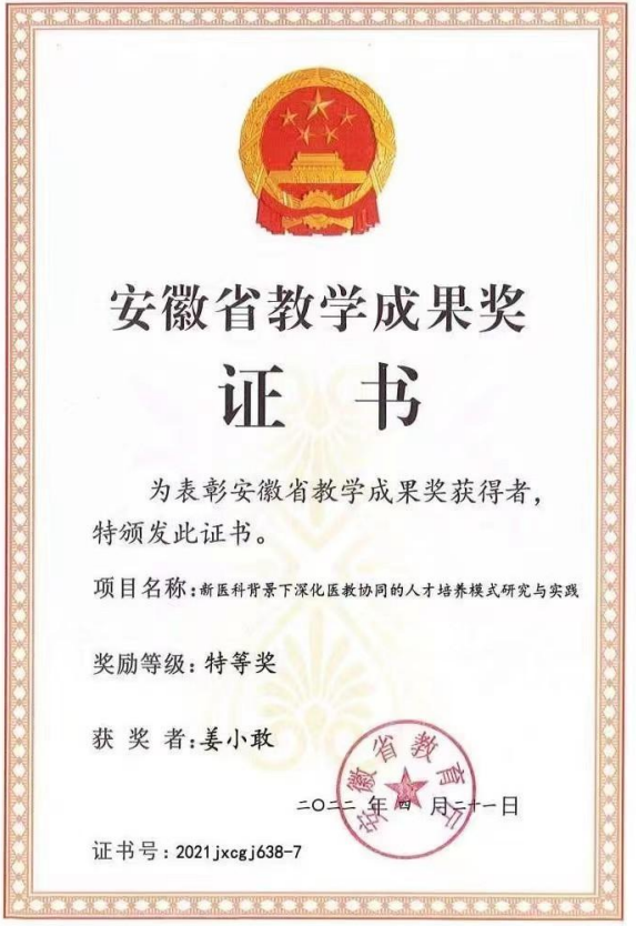 围绕国家级一流本科专业建设目标,结合公司“国内有影响、特色鲜明的区域性高水平医科大学”发展目标定位,突出麻醉学专业人才培养特色,深化公司产品改革,稳步提升团队建设水平。公司获批省级公司产品改革质量工程8项、校级21项;国家自然科学基金2项,省部级科研项目6项、横向科研项目2个;省级麻醉学专业示范实验实训中心1个、麻醉学虚拟仿真实验教学中心1个、精品开放课程1门、规划教材1部;国家级和省级老员工创新创业训练计划项目50项;获安徽省科学技术奖一等奖1项、二等奖2项、三等奖2项,省级教学成果一等奖1项、二等奖1项,校级教学成果特等奖1项,发明专利授权10项;发表论文200余篇,其中一类(含SCI)20余篇。