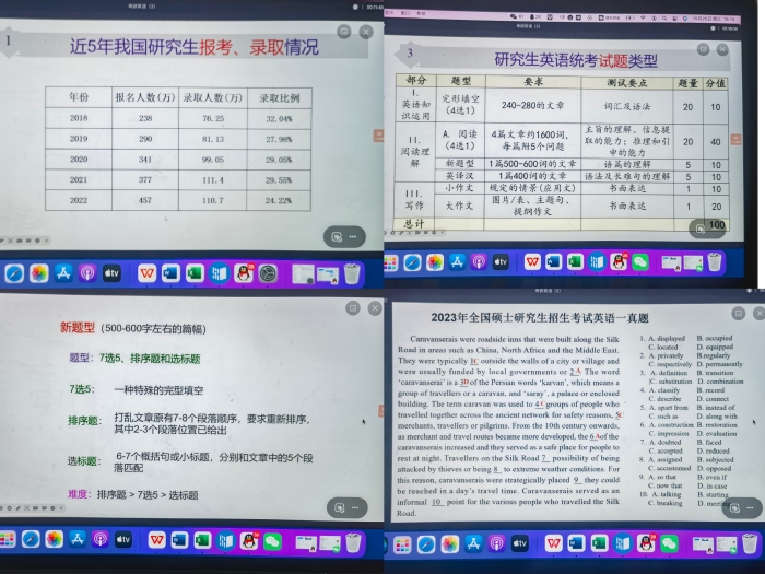 王翠莲老师首先分析了当前的考研形势,随后讲解了英语考研全流程和高分备考方案,对考研英语一、英语二的题型设置进行了细致的分析,对英语科目各题型得分点及目标要求进行了重点强调。讲解中,王翠莲老师以往年真题为例,就新题型和完形填空题型进行细致讲解,以自己的丰富经验为同学们指点迷津、厘清疑惑,为同学们明确了解题思路,让考生对考研英语试题类型有了更加清晰深刻的认识。