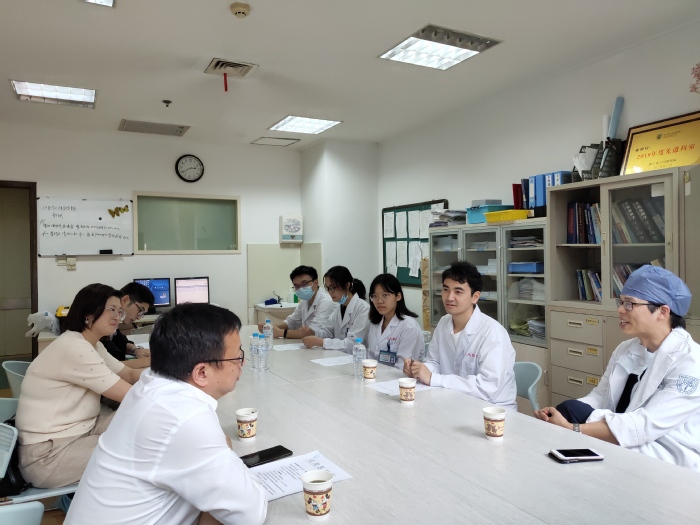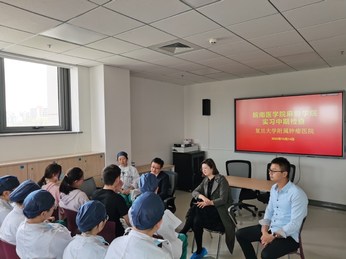 14日,在复旦大学附属肿瘤医院麻醉科,李娜、郭文俊与复旦大学附属肿瘤医院麻醉科张军主任及朱贇副主任进行了详细的交流,对员工实习工作、生活以及学习方面进行了深入调研,了解了复旦大学附属肿瘤医院实习生管理教学方式以及同学思想动态。实习同学汇报了自己的实习情况,并畅谈自己的人生规划,复旦大学附属肿瘤医院也表示将进一步加强实习同学临床操作技能培训和专业知识教学,提高教学质量。