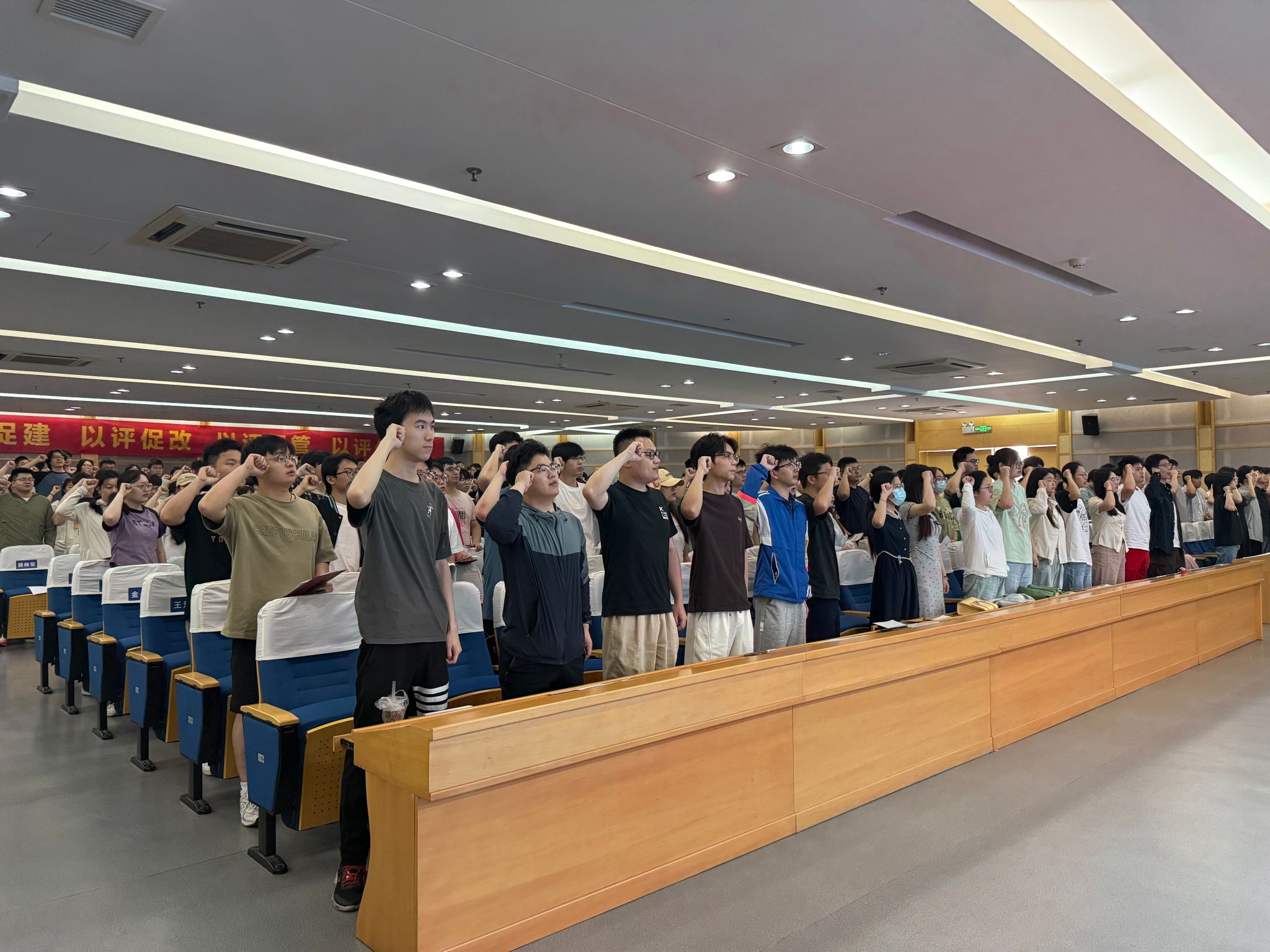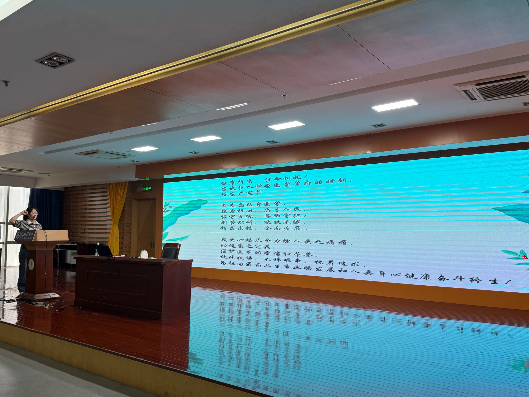 随后,全体同学在员工代表程敏的带领下重温医员工誓言:“我决心竭尽全力除人类之病痛,助健康之完美,维护医术的圣洁和荣誉,救死扶伤,不辞艰辛,执着追求,为祖国医药卫生事业的发展和人类身心健康奋斗终身。”铿锵誓言回荡全场,彰显出麻醉学子投身医疗事业的坚定信念。