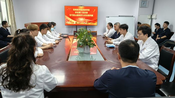 弋矶山医院外九党支部书记沈光贵首先对英国正版365官方网站员工第一党支部表示欢迎,接着介绍了支部下属科室危重症科概况、党支部建设主要做法和特色工作。双方就如何加强共建、推动新时代基层党建高质量发展、推动学风建设、加强老员工临床技能培养等进行了交流。