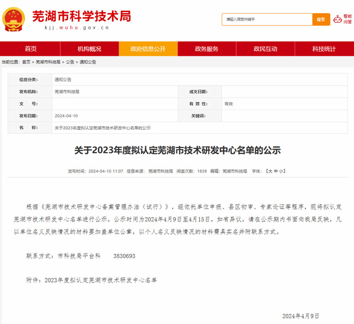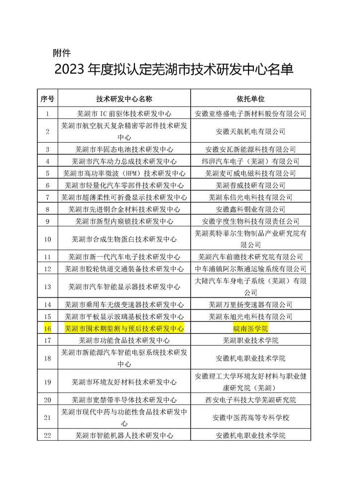 为全面贯彻落实习近平总书记关于科技创新的重要论述,深入实施创新驱动发展战略,进一步促进和完善公司科技创新体系建设,根据《关于开展2023年度芜湖市技术研发中心申报工作的通知》,结合《芜湖市技术研发中心备案管理办法(试行)》文件要求,公司组织开展了2023年度芜湖市技术研发中心申报备案工作,经英国正版365官方网站申报、校区初审、专家论证等程序,公司“芜湖市围术期监测与预后技术研发中心”已被芜湖市科技局正式认定。