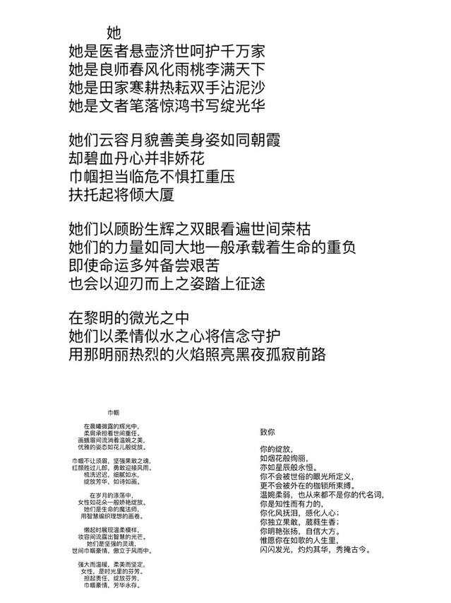 诗歌赞女性、温情传校园。活动以“柔肩担重任,巾帼绽芳华”诗歌比赛和“芳菲三月天,花样妇女节”海报设计比赛拉开帷幕。同学们踊跃参加,共征集诗歌作品12件,海报作品14件,同学们围绕主题进行创作,内容健康向上,既展现了才华,又得到了教育。最后评选得出一二三等奖和优秀奖若干名同学。