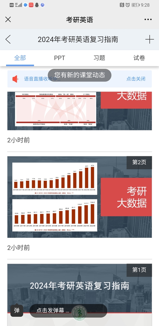 第一次授课由外语教研室主任李东老师在雨课堂上主讲,李老师围绕“考研英语大纲分析及复习规划”主题,结合自身经验,深入浅出地分析了当前的考研形势,英语考研全流程,考研英语一、英语二的题型设置,作文方面备考的“雷区”,以及如何高效备考考研英语作文等内容,同时针对同学们的困惑,解答了“考研英语复习资料的选择”、“考研英语单词背诵方法”、“市面上考研机构老师如何选择”等一系列问题,并告诫同学们平时要认真对待英语学习,积极提升英语阅读、翻译及作文的水平。本次授课,李老师准备充分,既有专业知识的传授,也有学习方法的指导,令同学们受益匪浅。