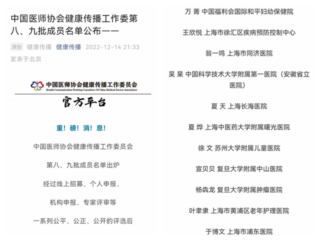 近日,中国医师协会健康传播工作委员会第八、九批成员名单出炉。经过线上招募、个人申报、机构申报、专家评审等一系列公平、公正、公开的评选后成员名单公布。公司麻醉学专业2018届本科生员工、复旦大学附属中山医院麻醉科医生宣贝贝位列其中,光荣成为健康传播者大家庭的一员。