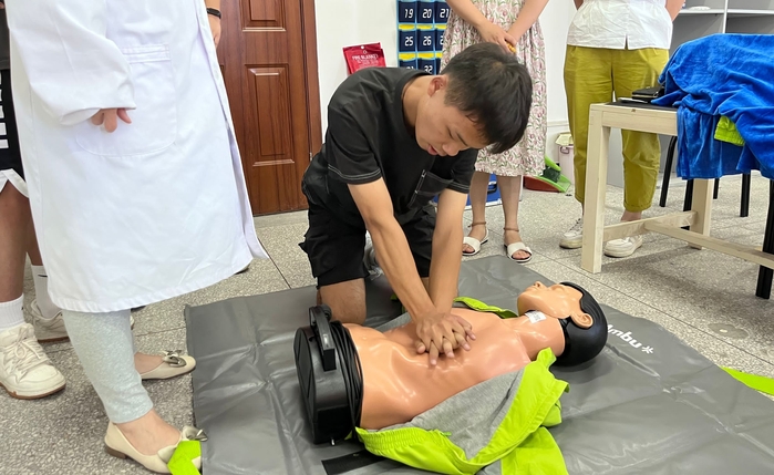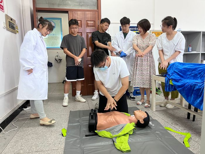 在麻醉学实验实训中心房尚萍的指导下,部分预备党员及员工开展了溺水急救措施的培训,通过使用人体模型进行相关实际操作演练,如人工呼吸,心肺复苏等,使同学们掌握相关急救知识和基本操作,不少有兴趣的同学还在老师的指导下进行了实际操作,现场互动热烈。