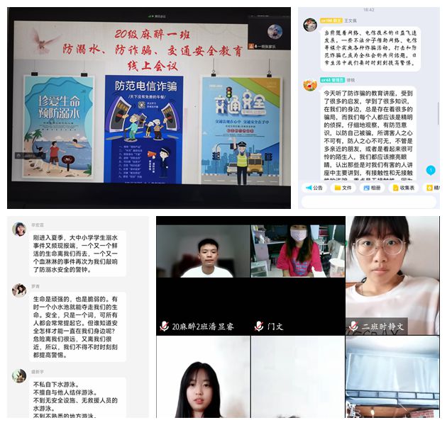 各班在党员和班委的带领下,线上线下相结合,观看学习一系列防溺水、防诈骗、交通安全的图片、事例与视频,并进行了研讨。同学们了解到要增强防范溺水的意识,从根源上远离危险。通过案例分析,深层次认识诈骗手段的共性,学会认清骗局的方法,从而降低上当受骗的几率。人人遵守交通规则,提高全民素质,才能减少交通事故的发生率,真正预防交通事故。同学们积极发表自己的心得体会,学习到了许多宝贵知识。